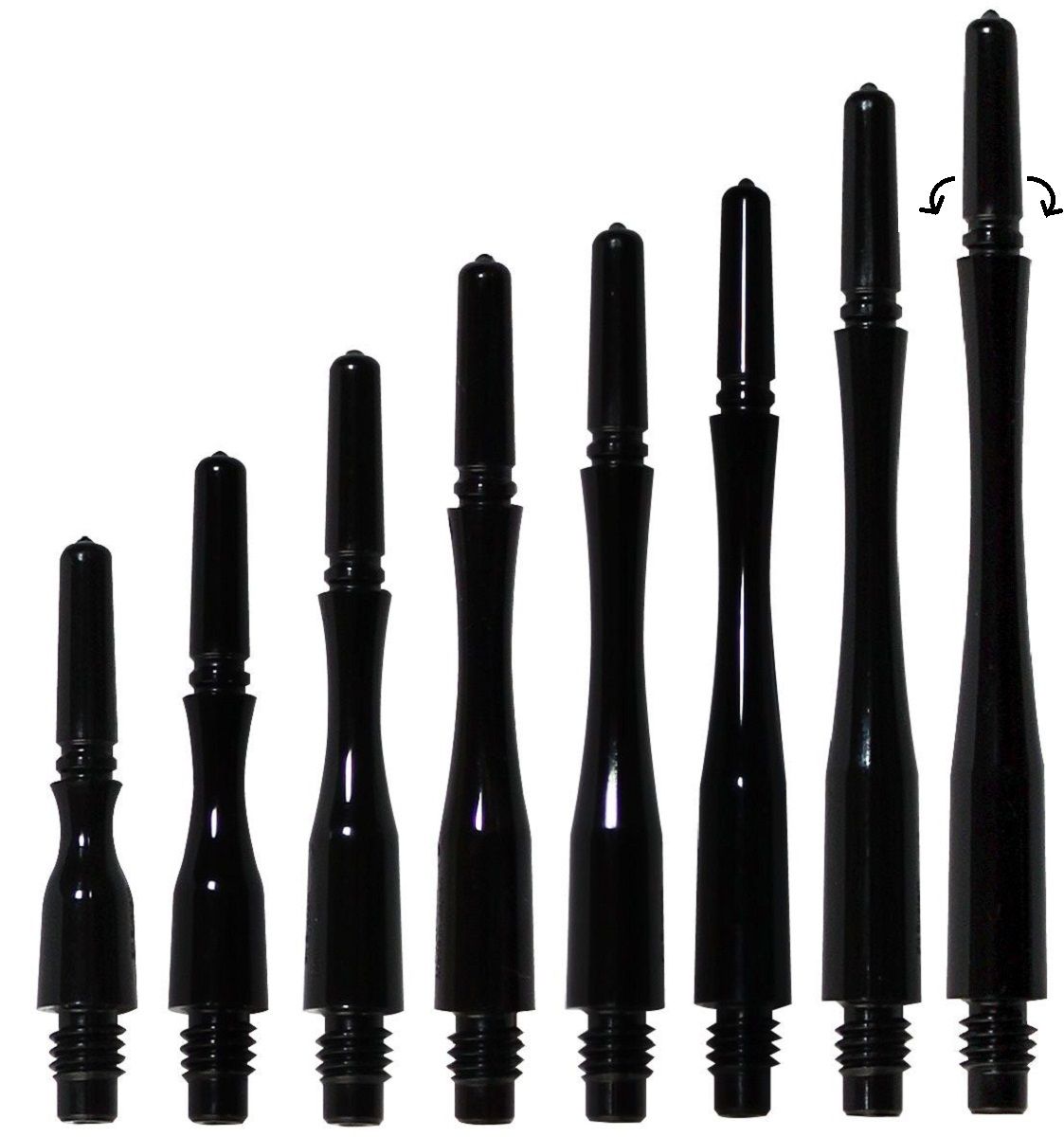 Die Shafts gibt es in acht Längen. Spinning, steht für drehen und bedeutet, dass die Tops rotierend sind, der Flight macht einem aufprallenden Dart Platz, dreht sich auf die Seite und minimiert somit die Bouncer Rate und erhöht somit die Haltbarkeit der Flights und Shafts enorm.