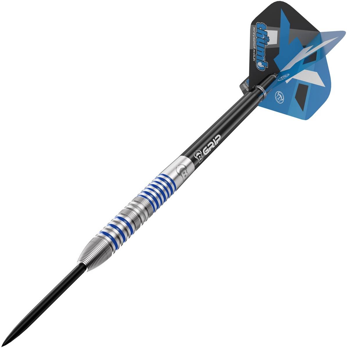 Dezente blaue Akzente verleihen dem Dart eine elegante Optik und verbinden Technik und Stil auf harmonische Weise. Abgerundet wird das Setup durch den schwarzen B-Grip 2 Schaft (Medium) und den Kciuk Metrixx Flight (150 Mikron), die Stabilität und präzise Flugbahnen sicherstellen.