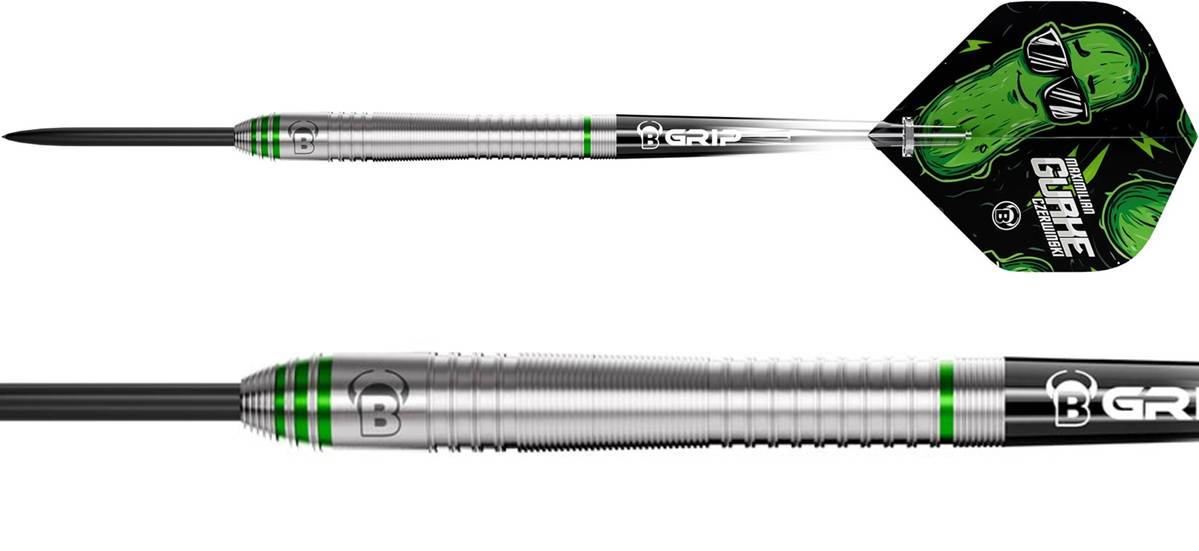 Abgerundet wird das Setup durch den B-Grip 2 TTC Schaft in Medium sowie den Max Czerwinski Metrixx Flight mit dem ikonischen Gurken-Design – für stabile Flugeigenschaften und einen unverkennbaren Auftritt am Oche.