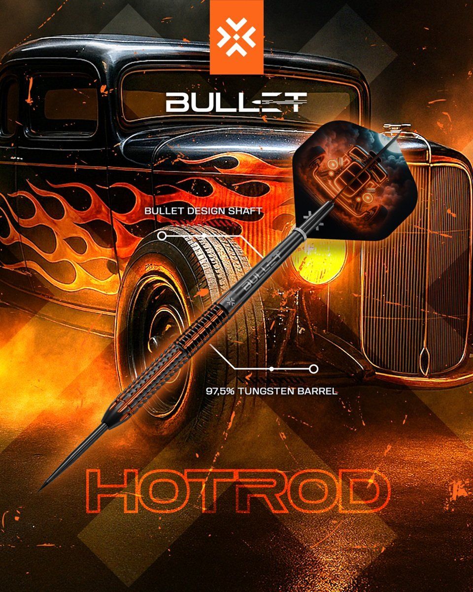 Spüre die Kraft des Hotrod Darts bei jedem Wurf. Mit einem extrem hohen 97,5 % Tungsten-Anteil bietet dieser Dart eine besonders schlanke Bauweise und maximale Kontrolle auf engstem Raum – perfekt für präzises Scoring.