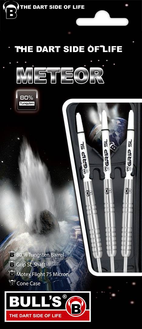 Der Meteor ist der ideale Einstieg in die Tungsten-Klasse. Gefertigt aus hochwertigem 80% Tungsten stehen dreizehn Barrelvarianten mit unterschiedlichen Gewichten und Grip zur Auswahl.Der MT7 ist ein gerades, schlankes Barrel mit einem breiteren Bereich mit Ringed Grip in der vorderen Hälfte und einem schmalen Bereich in der hinteren Hälfte. Im handlichen BULL'S Cone Case mit B-Grip SL Schäften und Motex Flights im speziellen Meteor Design.
