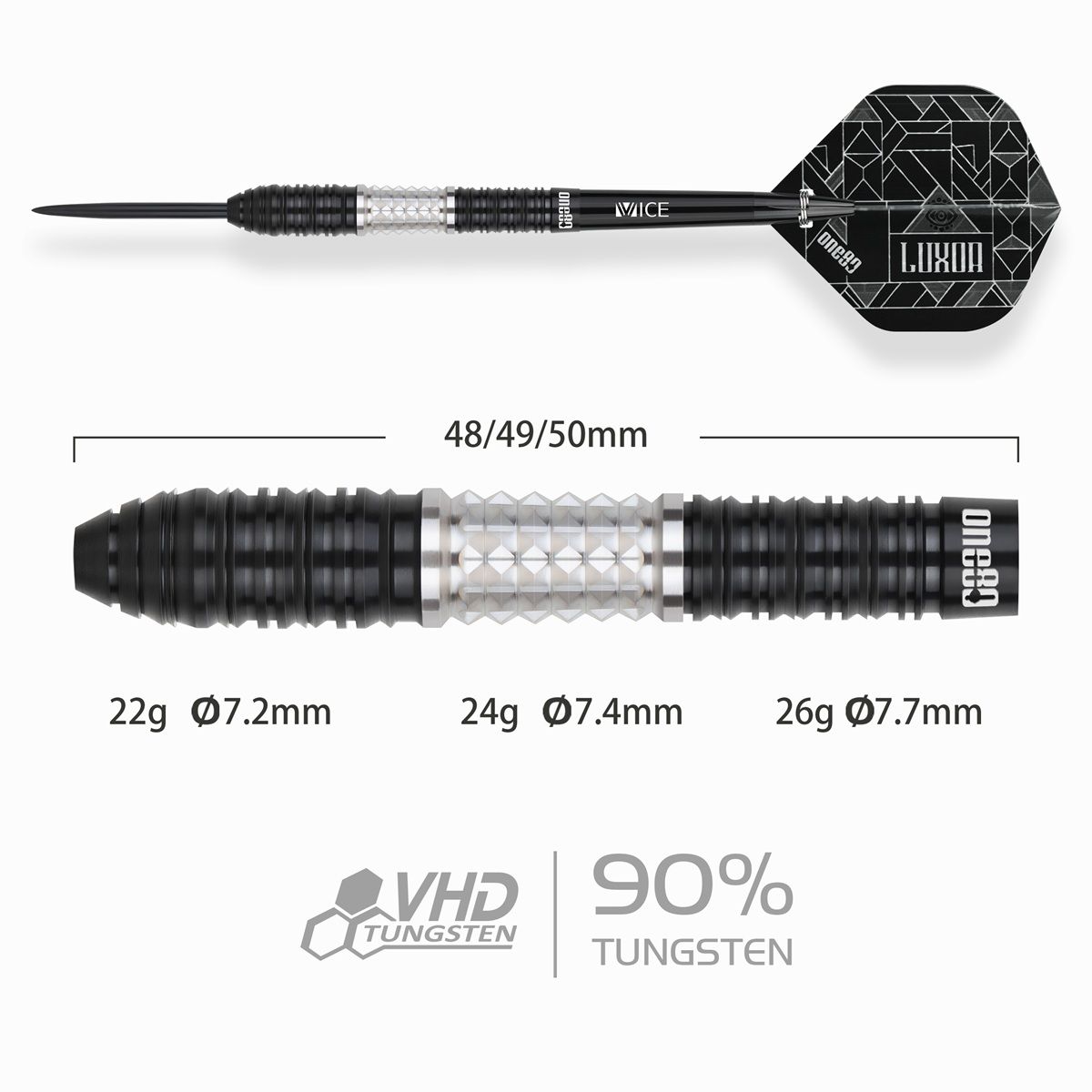 Steeldartpfeile aus dem Hause ONE80 mit 90% Tungsten Anteil. Gewicht= Barrelgewicht.