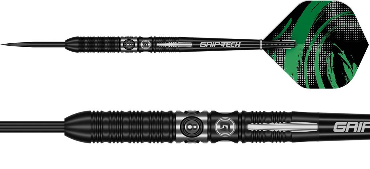 Das 90 % Tungsten Barrel sorgt für eine schlanke, perfekt ausbalancierte Form, während die schwarze PVD-Beschichtung nicht nur eine edle Optik bietet, sondern auch ein griffiges, kontrolliertes Wurfgefühl vermittelt – inspiriert von der Rotation und Dynamik eines Queue-Stoßes. Im Zentrum des Barrels sitzt die markante 8-Ball-Grafik, die diesem Dart seinen unverwechselbaren Charakter verleiht.