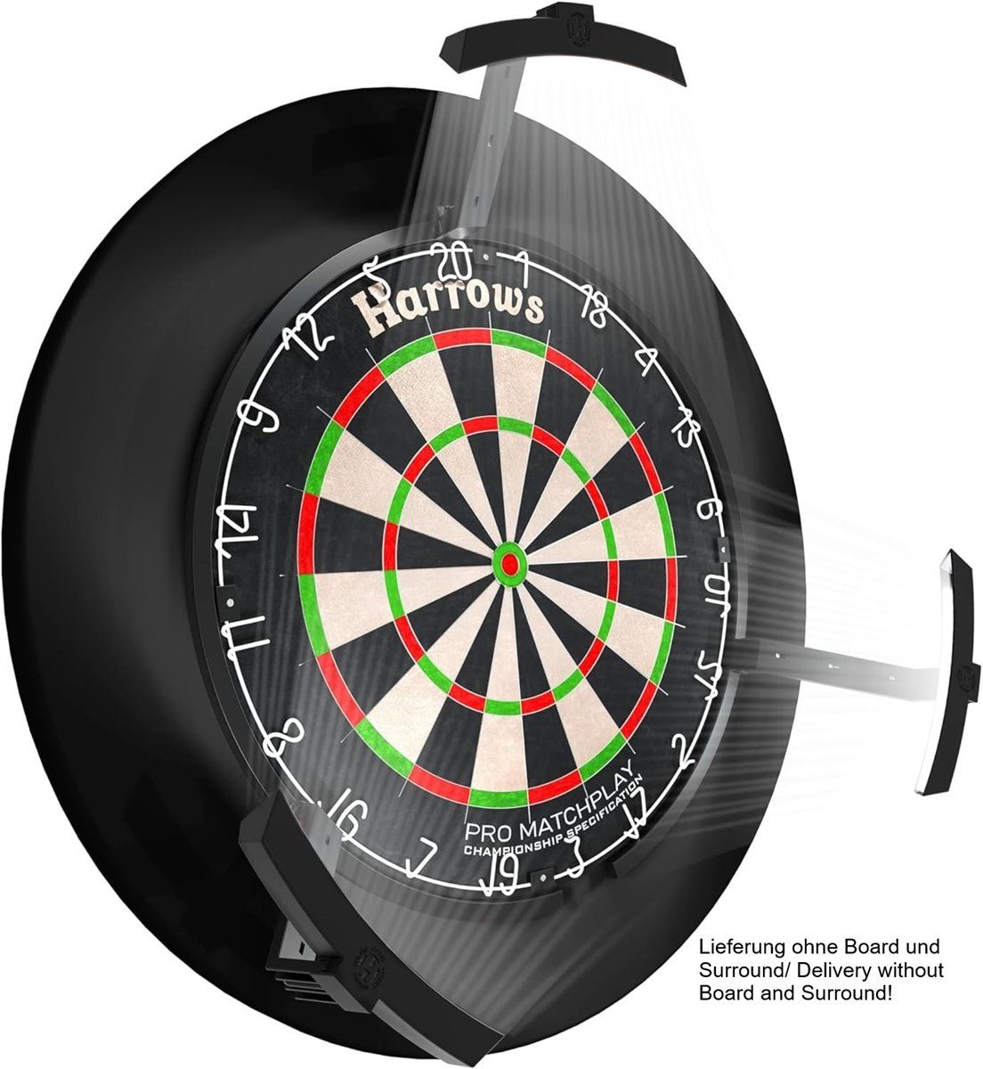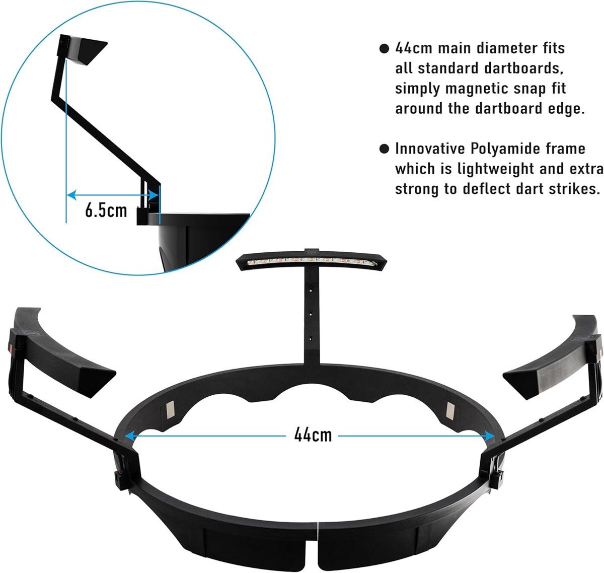 Ein einzigartiges neues Beleuchtungssystem, das Spielern maximale Dartboardbeleuchtung bei minimaler Behinderung bietet. Das Trilight verfügt über drei ultrahelle LED-Leuchten, die sich einfach mit dem Hauptrahmen verbinden lassen und so ein Teil bilden. Die Leuchten werden einfach an der Außenseite des Dartboards angebracht und mit starken, eingebauten Magneten fest an ihrem Platz gehalten. Das Trilight hat 65 % weniger Sichtbehinderung als ein normales Vollkreis-Beleuchtungssystem, was bedeutet, dass die Spieler sich besser auf das Dartboard konzentrieren können. Es bedeutet auch, dass das Herausnehmen der Darts einfach ist, also ideal für Spieler jeden Alters und jeder Größe. Die Installation ist schnell und erfordert kein Werkzeug. Das Trilight passt auf alle Dartboards mit Stahlspitze. Die Arme können abgenommen und das Dartboard mit dem noch angebrachten Rahmen in eine Reisetasche gepackt werden, sodass es auch das perfekte Reiselicht ist.