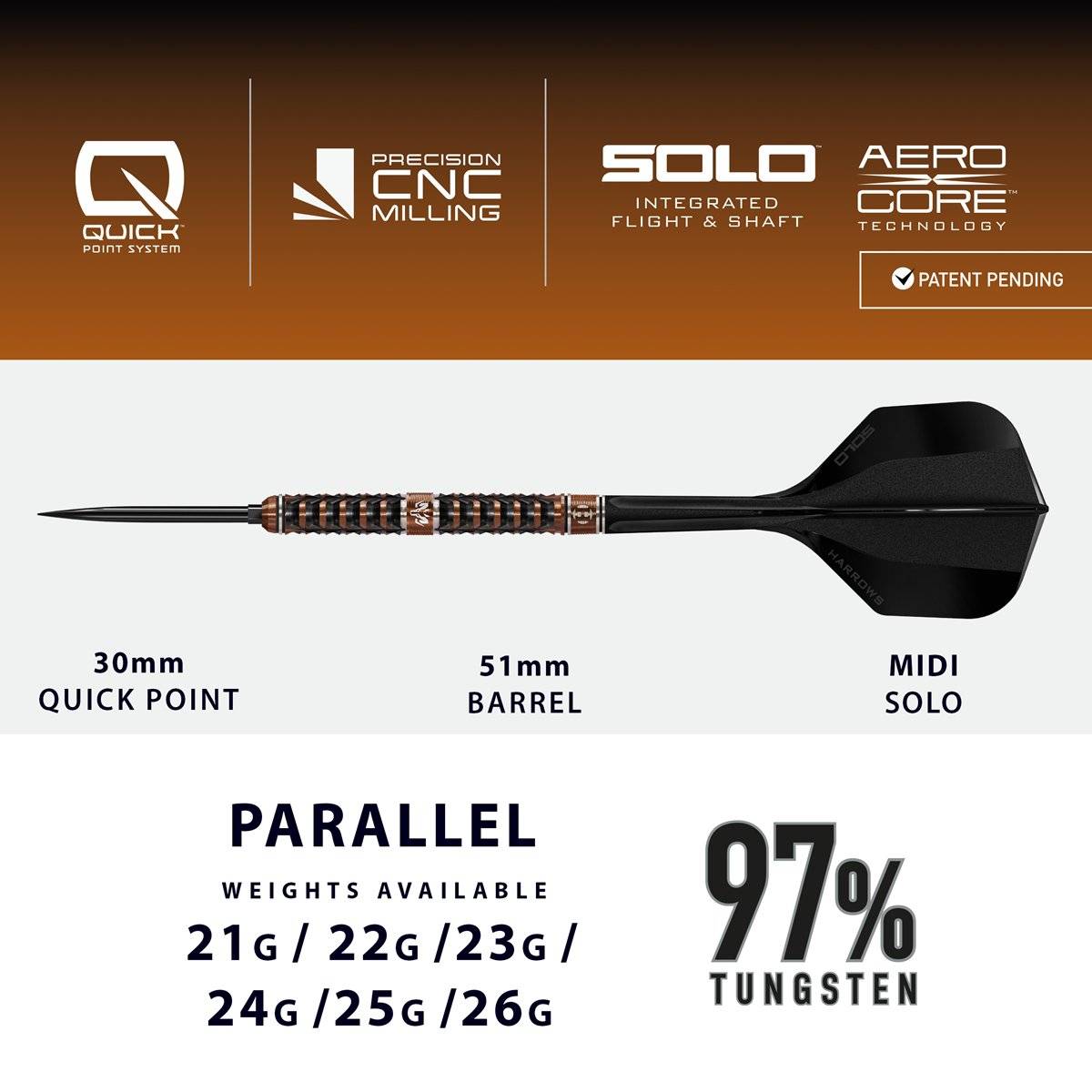 Optisch setzt der Wolfram Trinity QP mit seiner schwarz-kupferfarbenen Beschichtung ein kraftvolles Statement. Die hochwertige Titanium-Nitride-Beschichtung erhöht nicht nur die Haltbarkeit, sondern verleiht dem Dart auch eine edle, markante Optik.