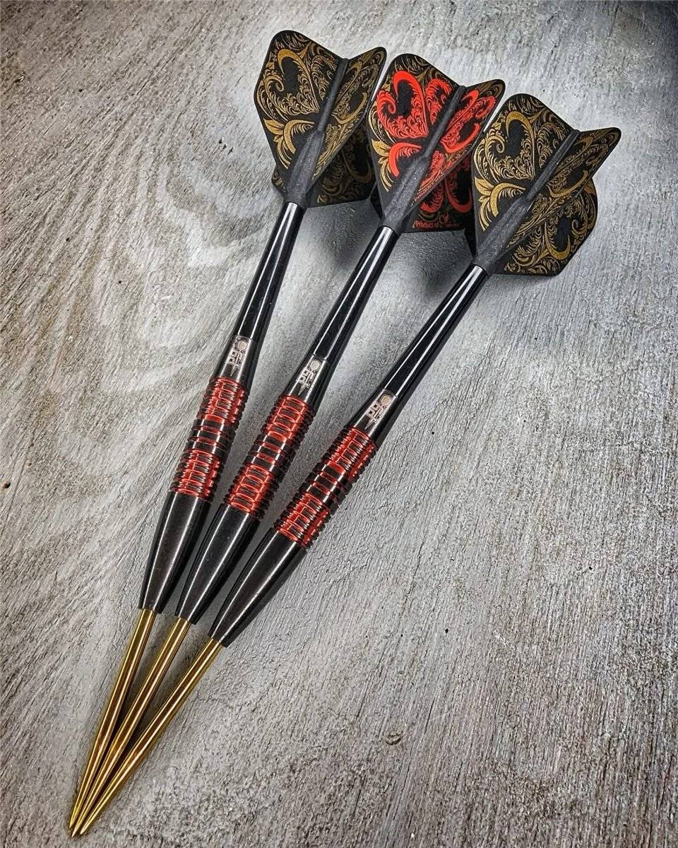 Die Steeldartpfeile aus dem Hause "P9 Darts" bestehen aus einem 90% Tungsten Barrel, welcher mit einer hochwertigen schwarzen Titanium PCT Beschichtung überzogen ist und mit einer Spitze in Gold ausgestattet ist.