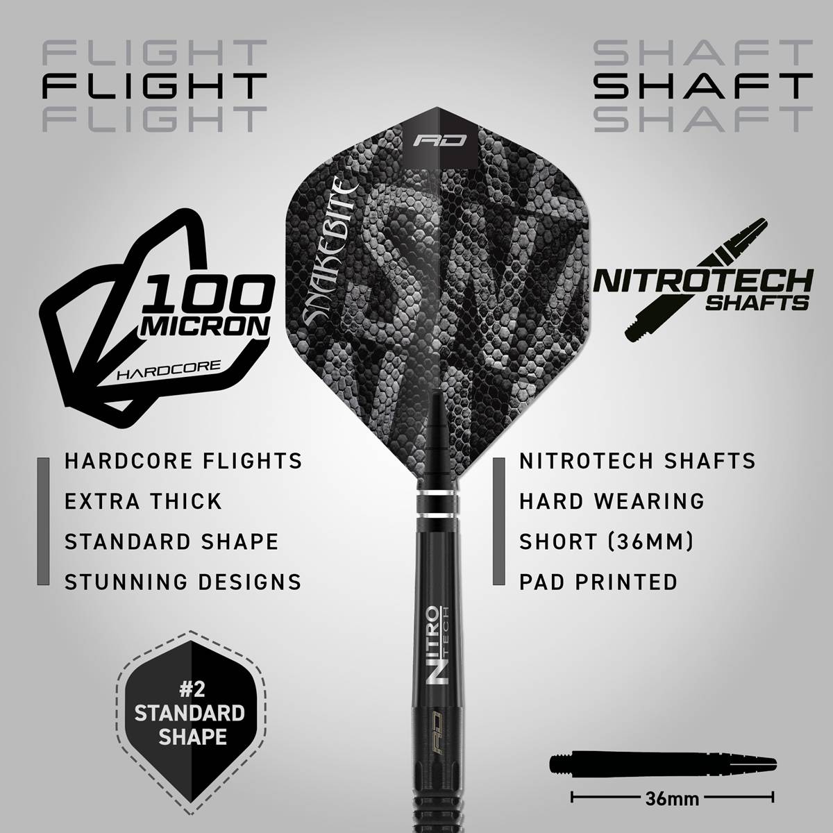 Das komplett schwarze Design unterstreicht den professionellen Charakter dieser Darts, während die Snakebite Signature Flights den unverwechselbaren Stil und die Energie von Peter Wright widerspiegeln.