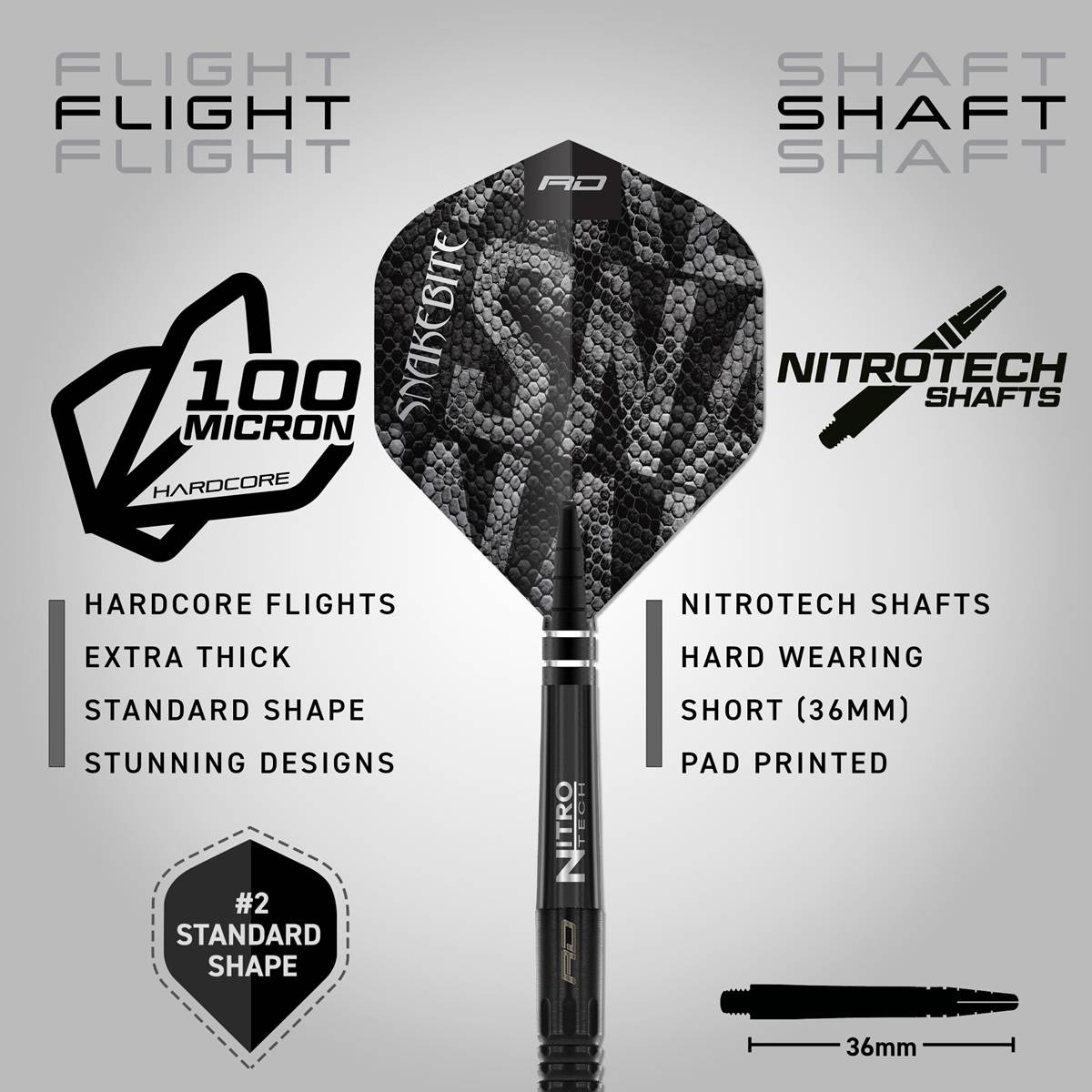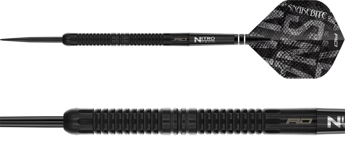 Das komplett schwarze Design unterstreicht den professionellen Charakter dieser Darts, während die Snakebite Signature Flights den unverwechselbaren Stil und die Energie von Peter Wright widerspiegeln.