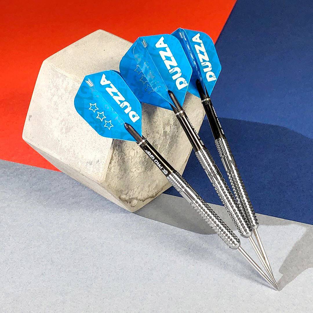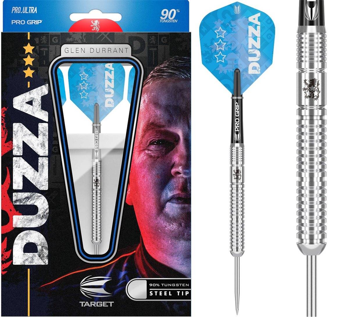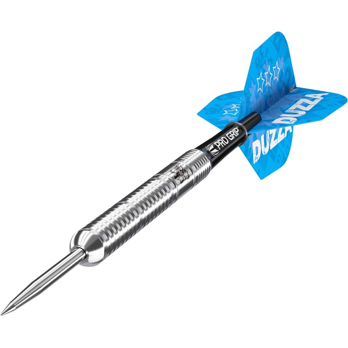Der Dart von Glen "Duzza" Durrant aus dem Hause Target hat einen Barrel aus 90% Tungsten. Komplett mit Black Pro Grip-Schaft und auffälligen "Duzza" Flights in blau.