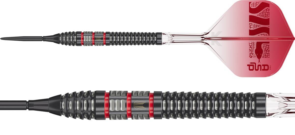 Die präzise gefrästen Ringgrip-Segmente sorgen für einen sicheren, gleichmäßigen Halt, während die markanten roten Akzente sowohl optisch als auch funktional überzeugen. Das gerade Barrel-Design ermöglicht einen sauberen, kontrollierten Wurf und eignet sich für verschiedenste Wurftechniken.
