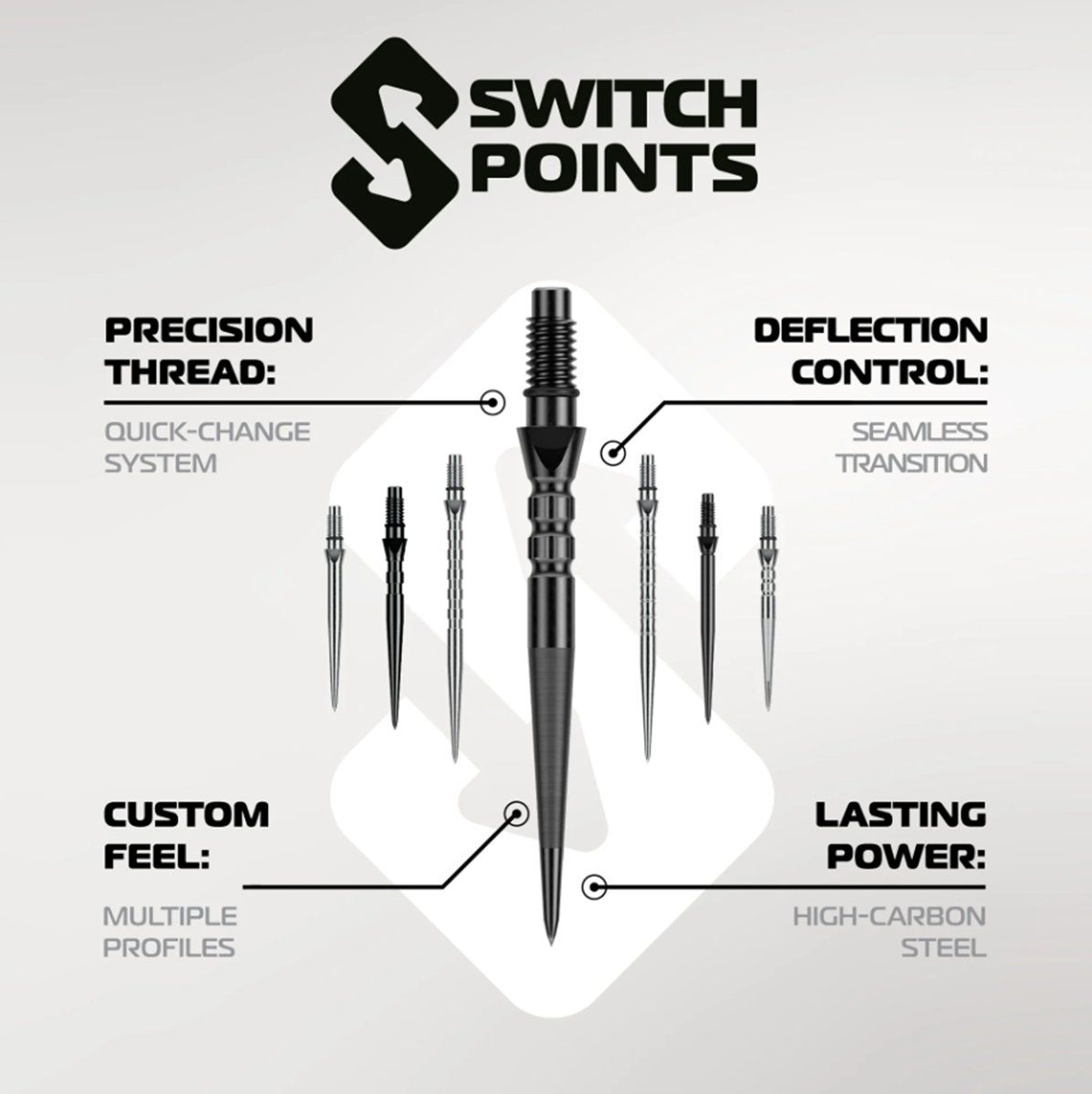 Die Winmau SwitchPoint Chain Dartspitzen vereinen modernste Technik mit außergewöhnlichem Spielkomfort und einem einzigartigen Design. Dank der innovativen Rapid Point Change Technology lassen sich die Spitzen in wenigen Sekunden wechseln – sicher, präzise und ohne Spiel.