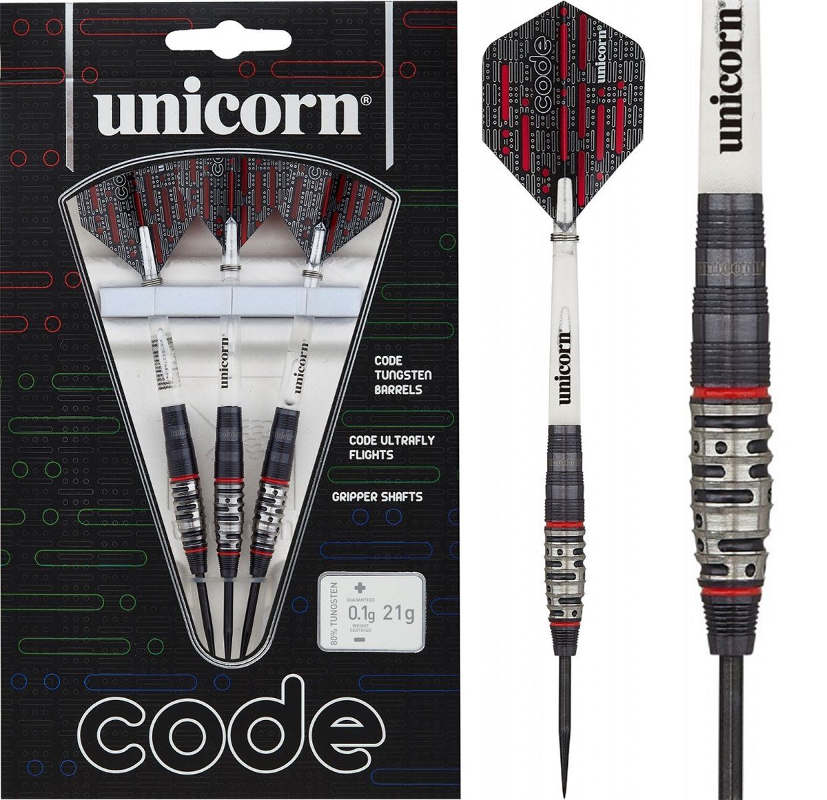 Unicorn Code Steeldarts, gefertigt in hochwertiger 80% Tungsten Qualität. Das Gewicht ist mit +/- 0,1g garantiert.