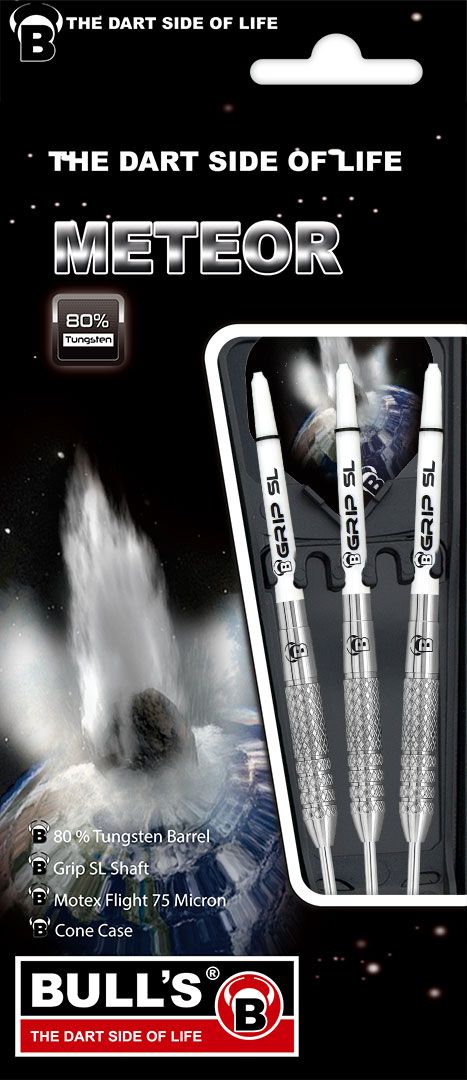 Der Meteor ist der ideale Einstieg in die Tungsten-Klasse. Gefertigt aus hochwertigem 80% Tungsten stehen dreizehn Barrelvarianten mit unterschiedlichen Gewichten und Grip zur Auswahl. Der MT8 verfügt über einen unterschiedlich stark ausgeprägten Bereich mit Knurled Grip in der vorderenHälfte. Im handlichen BULL'S Cone Case mit B-Grip SL Schäften und Motex Flights im speziellen Meteor Design.x Flights im speziellen Meteor Design.