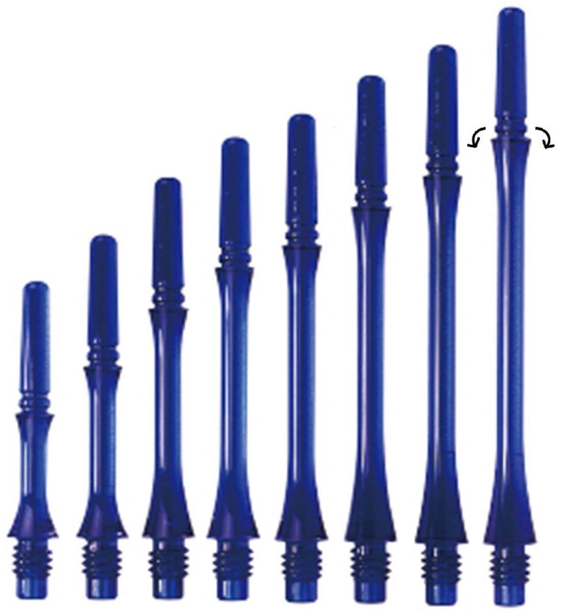 The shafts are available in eight lengths. Spinning stands for turning and means that the tops are rotating, the flight gives way to an impacting dart, turns on its side and thus minimizes the bouncer rate and thus increases the durability of the flights and shafts enormously.