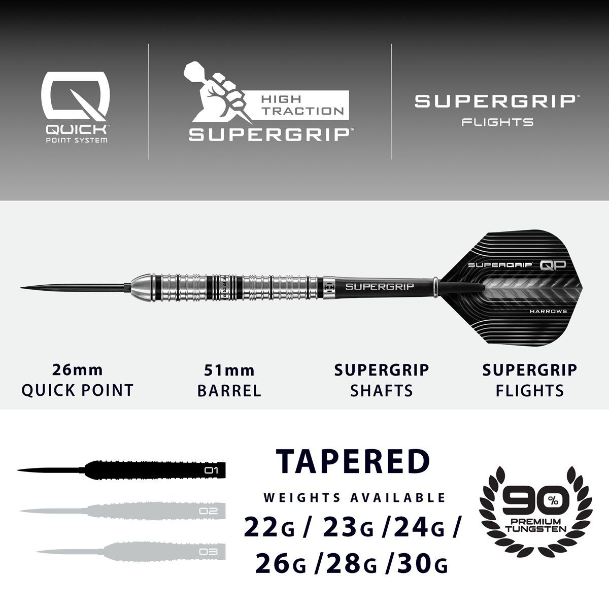 Harrows Supergrip QP Tapered 90% Steeldarts 22/23/24/26/28/30 Gram