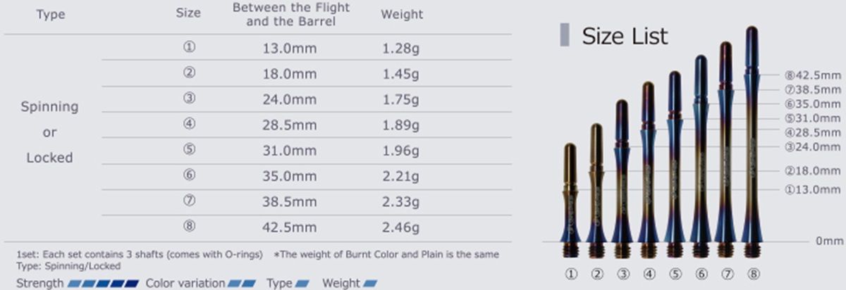The shafts are available in eight lengths. Locked, stands for fixed and means that the tops are not rotating, but the flight makes room for an impacting dart and turns slightly on its side, thus minimizing the bouncer rate enormously.