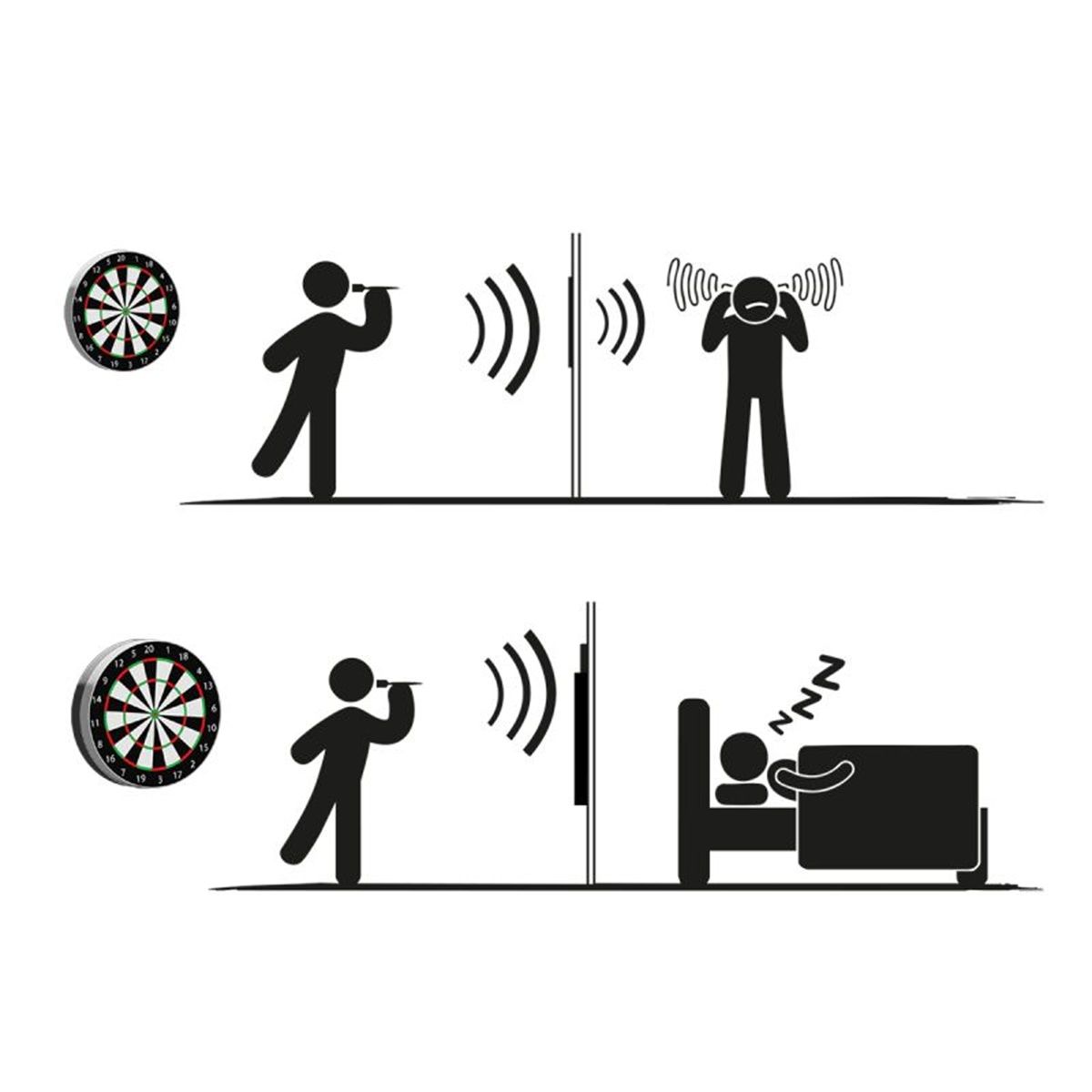 When darts hit the board, they create a characteristic knocking sound that can be disturbing for you, your family, or your neighbors. With the Karella Compact Sound Insulation, this problem is effectively solved. Developed in cooperation with acoustic experts, this innovative system reduces noise transmission by over 80%—allowing you to enjoy your darts anytime without disturbance.