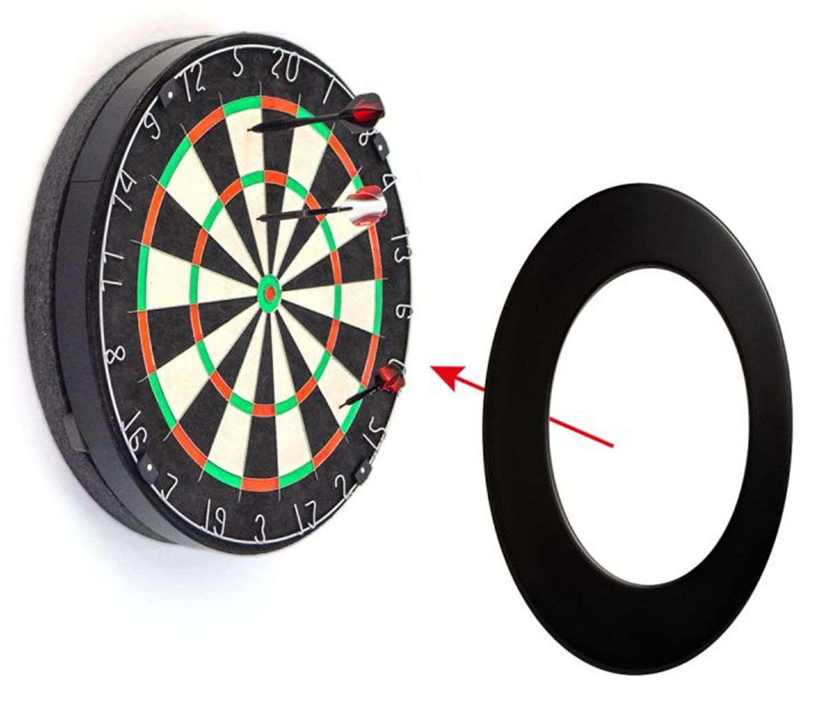 The anthracite-colored Compact Sound Insulation has the exact diameter of a standard tournament dartboard. This makes it fully compatible with all common dartboard surrounds and lighting systems.