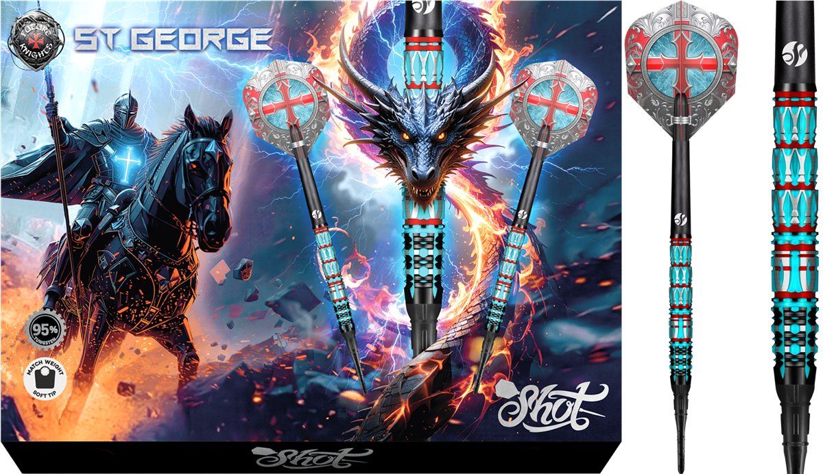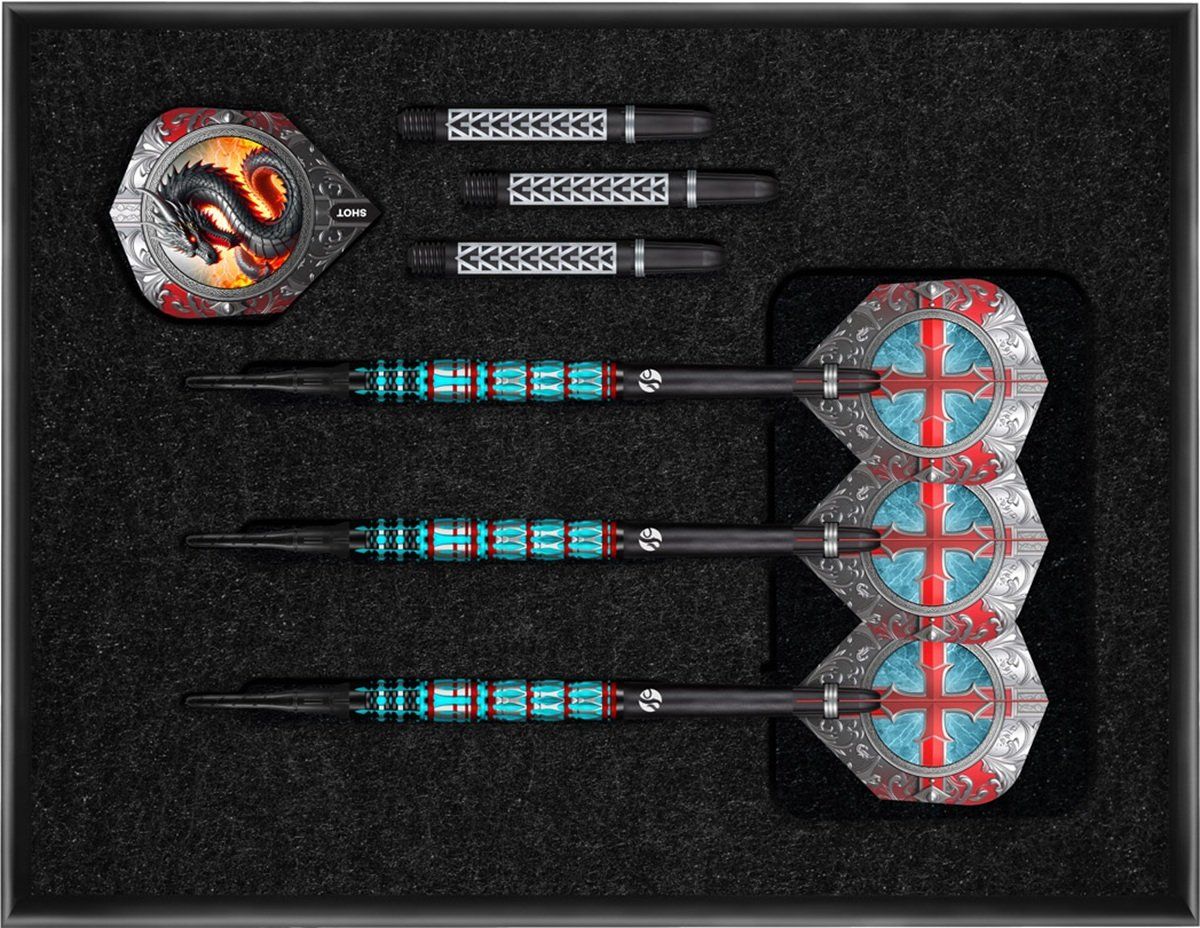 The Shot Future Knights St George 95% darts are forged for those who demand a bold aesthetic and exceptional control. Honoring the spirit of the legendary dragon slayer, these darts embody precision craftsmanship with a cutting-edge design. Combining 95% tungsten for professional-grade durability with a multi-faceted grip structure, they promise a consistently confident release on every throw.