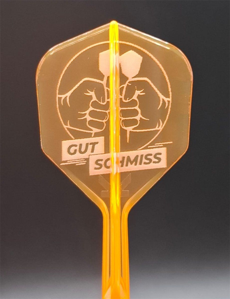 Copyrighted or protected content (e.g., sports teams, brands, musicians, dart players, etc.) cannot be engraved.