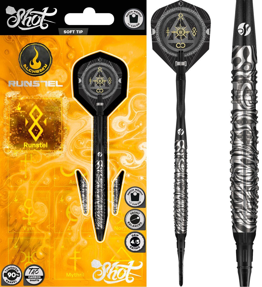 Die Shot Softtip Alchemy Runstel 90% 20g Darts vereinen präzise Verarbeitung mit langlebigen Materialien und wurden speziell für konstante Performance auf elektronischen Dartboards entwickelt.