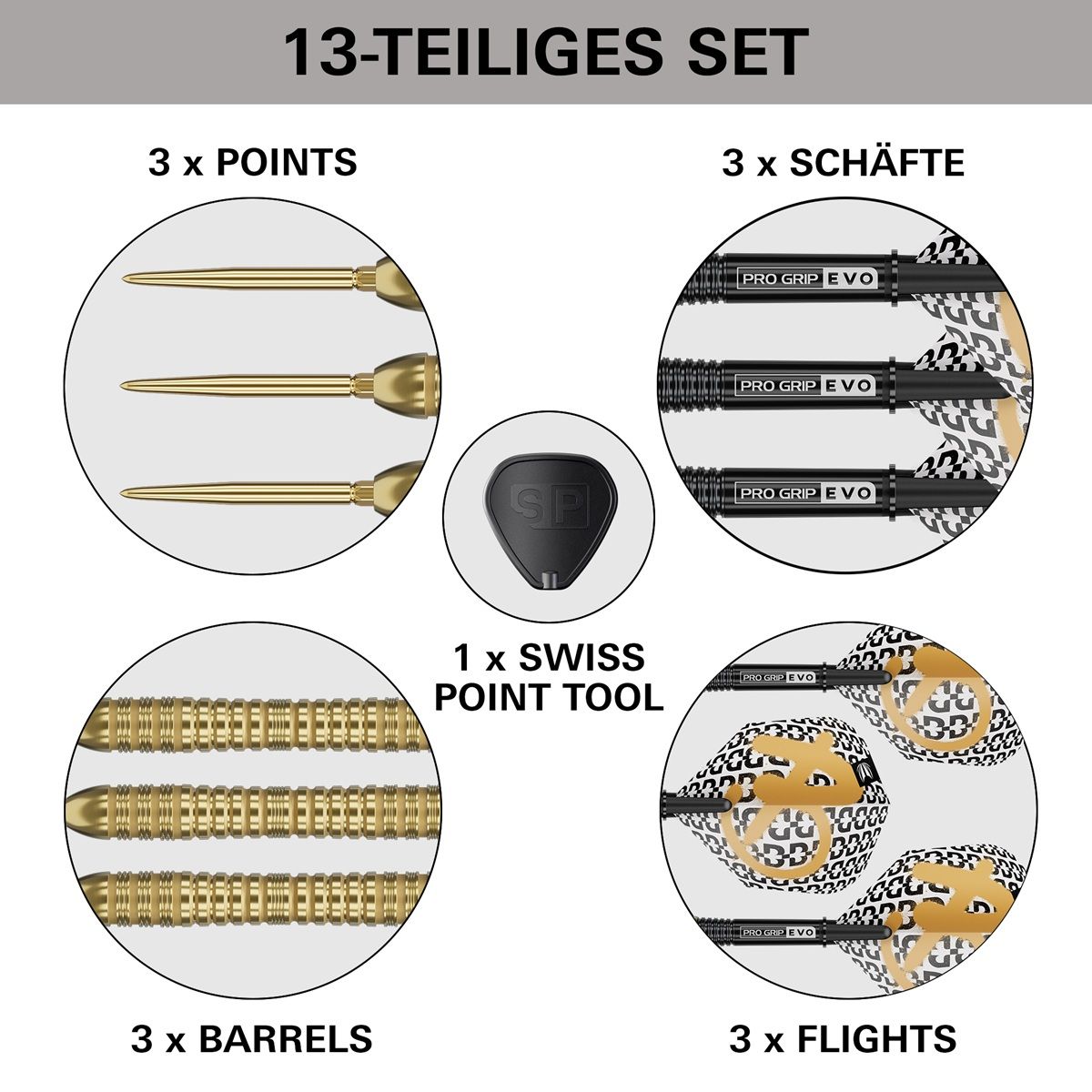 Das edle Gold-Finish unterstreicht die präzise Verarbeitung und verleiht den Darts eine stilvolle, hochwertige Präsenz am Board.