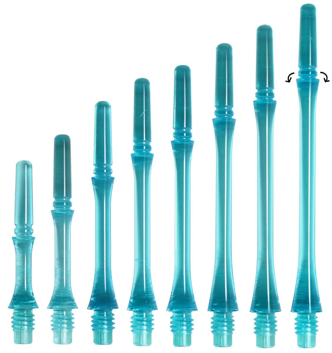 The shafts are available in eight lengths. Spinning stands for turning and means that the tops are rotating, the flight gives way to an impacting dart, turns on its side and thus minimizes the bouncer rate and thus increases the durability of the flights and shafts enormously.
