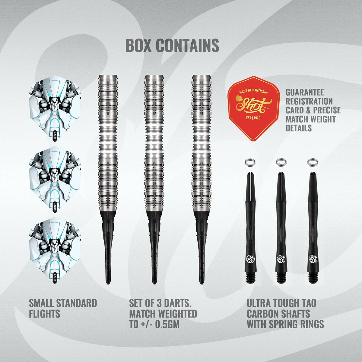The Shot AI Scorpula 90% darts are designed for the charger who values a lightweight profile, exceptional balance and razor-sharp design. With a high-quality 90% tungsten construction, these darts deliver durability and a slim, streamlined barrel that helps maintain consistent release and flight.